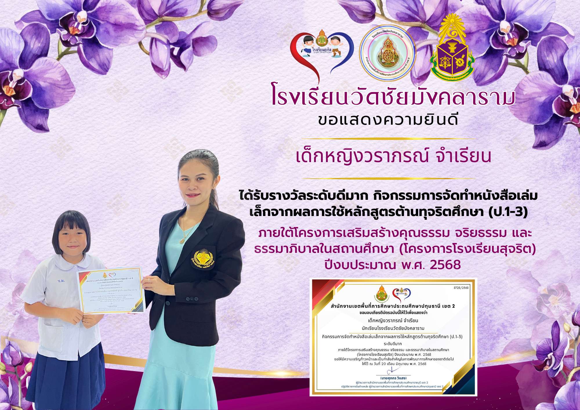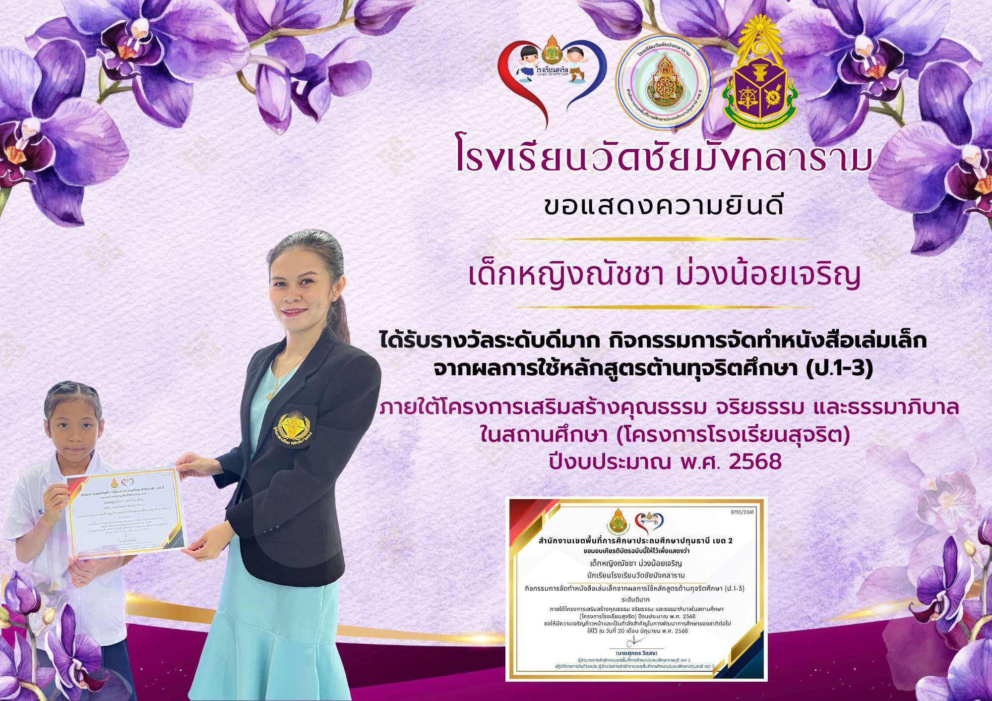 ได้รับรางวัลระดับดีมาก กิจกรรมการจัดทำหนังสือเล่มเล็กจากผลการใช้หลักสูตรต้านทุจริตศึกษา (ป.1-3)