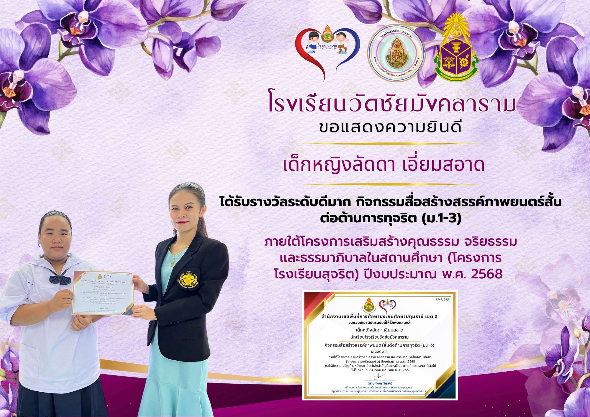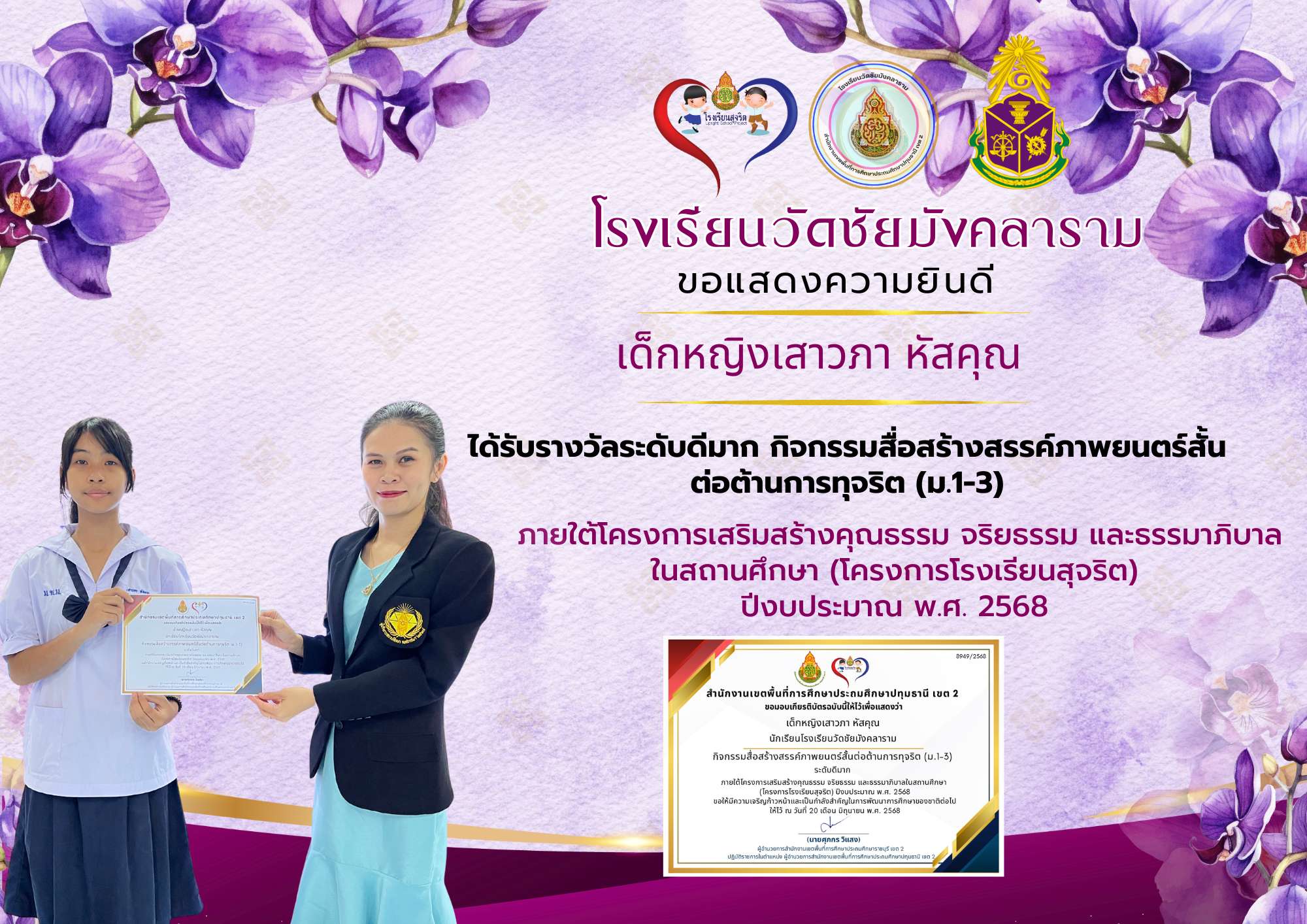 ได้รับรางวัลระดับดีมาก กิจกรรมสื่อสร้างสรรค์ภาพยนตร์สั้น ต่อต้านการทุจริต (ม.1-3)