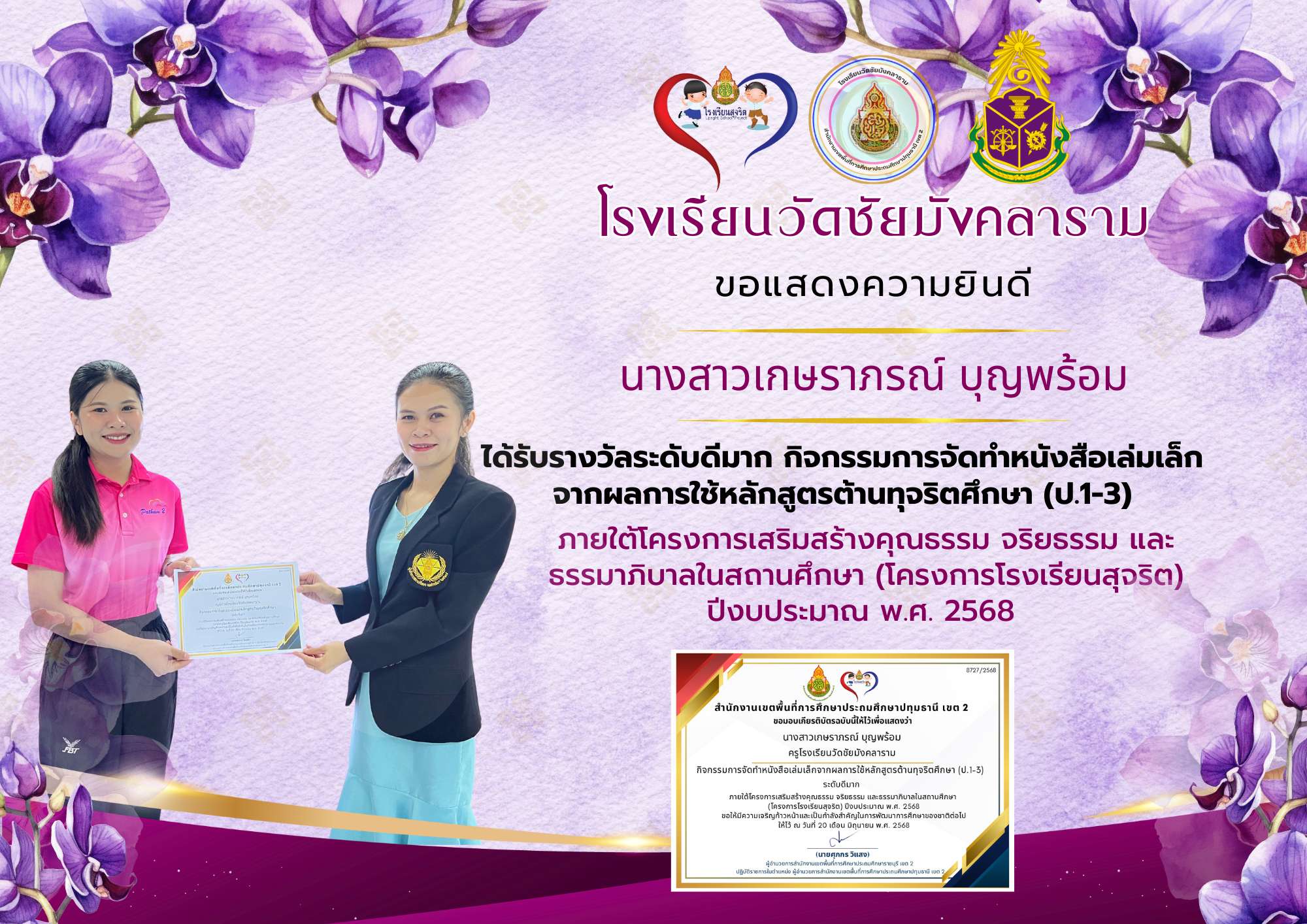 ชื่อผลงาน : ได้รับรางวัลระดับดีมาก กิจกรรมการจัดทำหนังสือเล่มเล็กจากผลการใช้หลักสูตรต้านทุจริตศึกษา (ป.1-3)