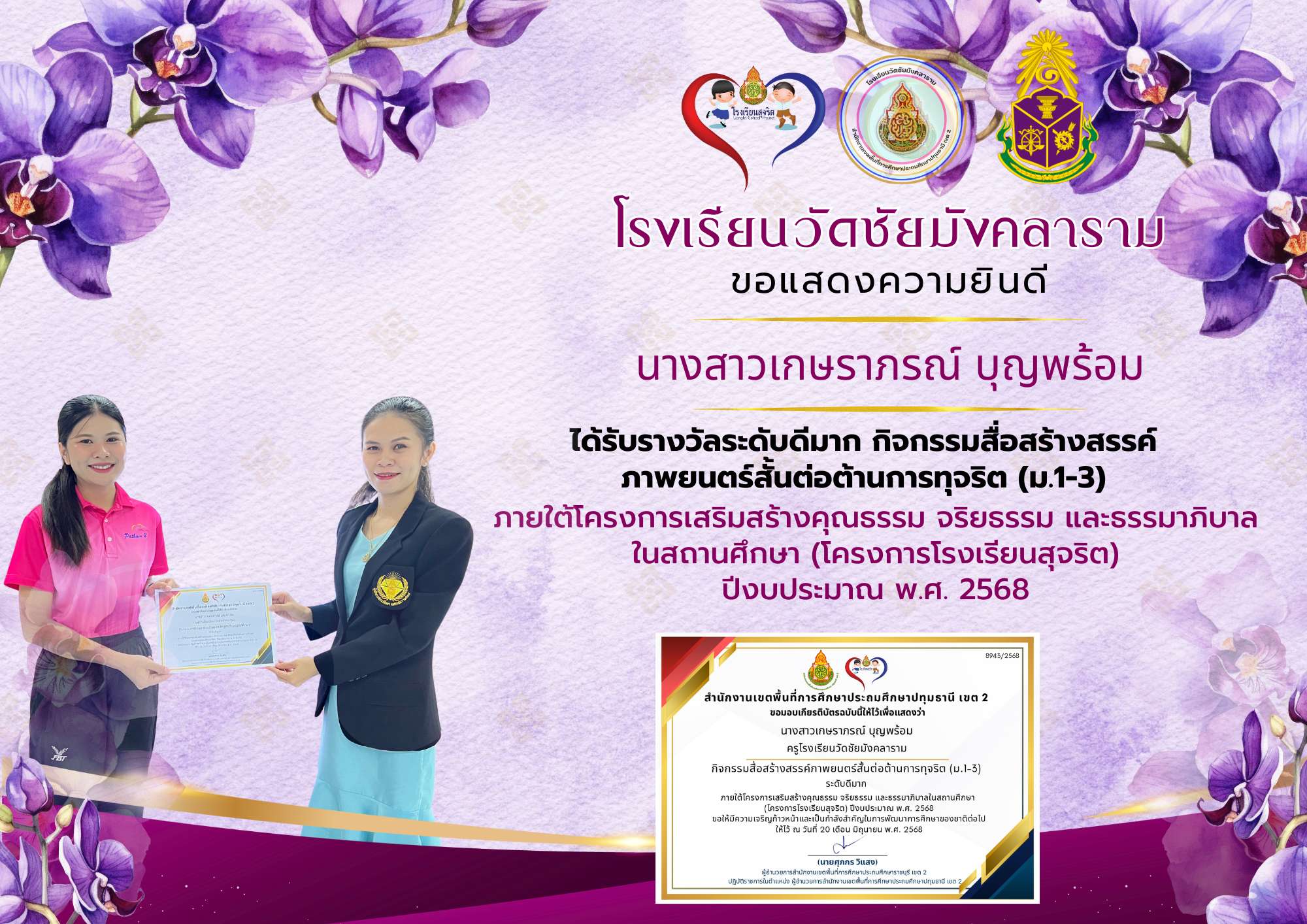 ชื่อผลงาน : ได้รับรางวัลระดับดีมาก กิจกรรมสื่อสร้างสรรค์ภาพยนตร์สั้นต่อต้านการทุจริต (ม.1-3)