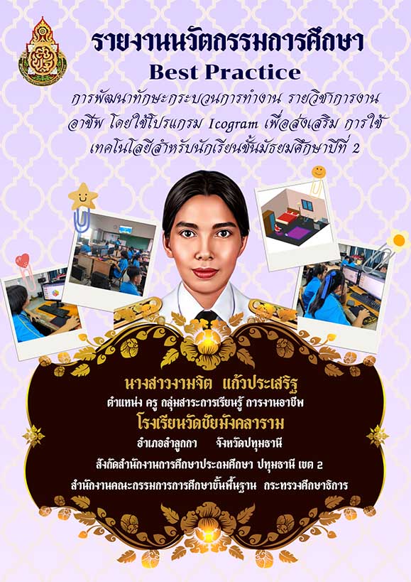 การพัฒนาทักษะกระบวนการทำงาน รายวิชาการงานอาชีพ โดยใช้โปรแกรม Icogram เพื่อ ส่งเสริม การใช้เทคโนโลยีส าหรับนักเรียนชั้นมัธยมศึกษาปีที่ 2 |